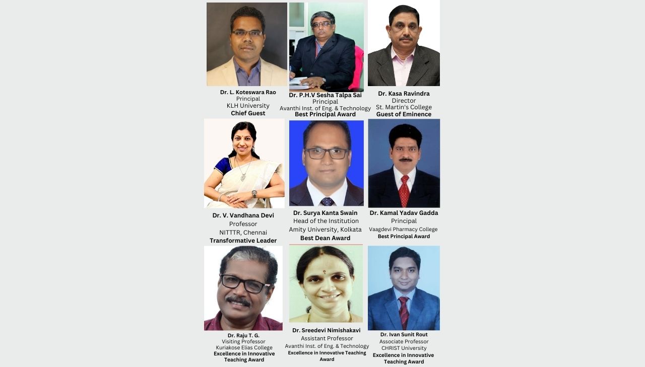 - Transformative Leader in Education of the Year 2025: Dr. Md. Rehaman Pasha (MRIET, Hyderabad), Dr. V. Vandhana Devi (NITTTR, Chennai), Dr. L. Koteswara Rao, KLH University, Hyderabad