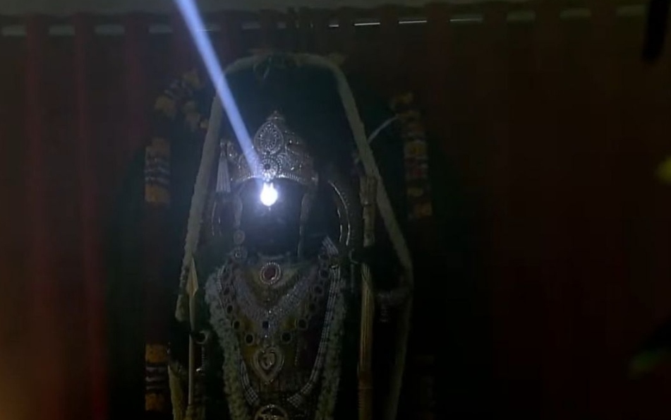 Images of the sun emblem adorning the deity of Ram Lalla at the Shri Ram Janmabhoomi Mandir in Ayodhya during the celebration of Ram Navmi.